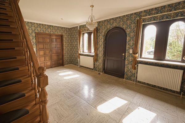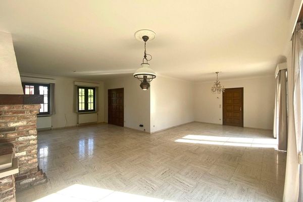 GLV: zeer ruime inkomhal (+/- 5,40 x 4,30), gastentoilet, bureelruimte (+/- 3 x 4,30m), ruime woonkamer (+/- 8,80 x 8,20m) voorzien van grote raampartijen uitgevend op het terras met uitzicht op de tuin. Verder voorzien van een geïnstalleerde keuken, berging en grote inpandige garage voorzien van 2 wentelpoorten.