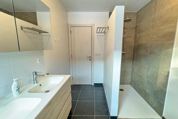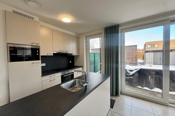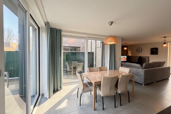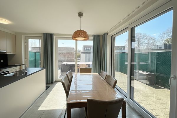 GLV: Inkomhal, gastentoilet, lichtrijke open leefruimte (+/- 8 x 4,8m) voorzien van grote raampartijen met zicht op het terras en de onderhoudsvriendelijke tuin (kwalitatief kunstgras / volledig omheind), volledig geïnstalleerde open keuken, ingerichte wasplaats/berging.