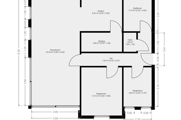 Inkomhal, toilet, zeer ruime leefruimte (+/- 8,50 x 3,80m) voorzien van grote raampartijen uitgevend op het terras en de privatieve tuin (+/- 128m2), geïnstalleerde keuken, berging/ wasplaats, badkamer (inloopdouche – lavabomeubel), 2 SLAAPKAMERS (+/- 3,80 x 3,20m) (+/- 3,10 x 2,20m).