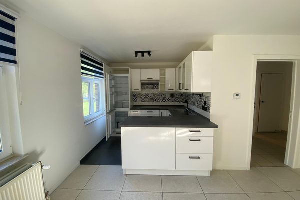 Indeling: inkomhal / ontvangsthal, ruime woonkamer (+/- 5,5m x 3,9m) met aansluitend de geïnstalleerde keuken, ingericht...